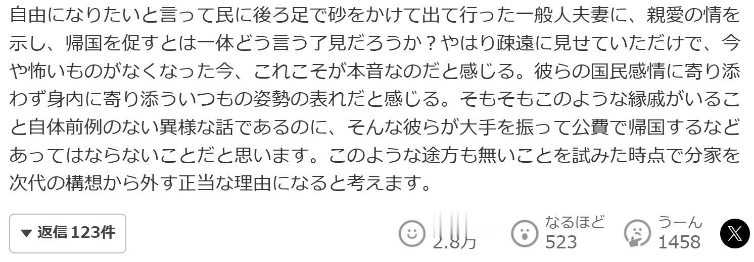 这不过是他们一贯的作风——不顾国民情感,只顾庇护亲信。拥有这样的亲属关系本身就是前所未有的异常现象,更遑论让他们大摇大摆地动用公费回国——这绝不可容忍。”