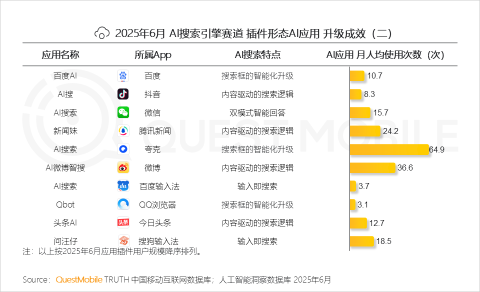 微博推出的“AI微博智搜”功能,6月复合增长率在41.7%。QQ浏览器推出的“Qbot”复合增长率达到了255.2%。