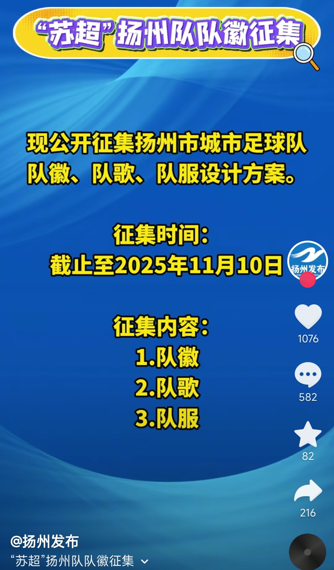 扬州不仅要征集队徽队服,还在征集队歌,扬州发布称“现公开征集扬州城市足球足球队队徽、队歌、队服设计方案”,而扬州队的奖励标准,和苏州的几乎一模一样。不知道是这两个市商量好的,还是省里有相应的标准。