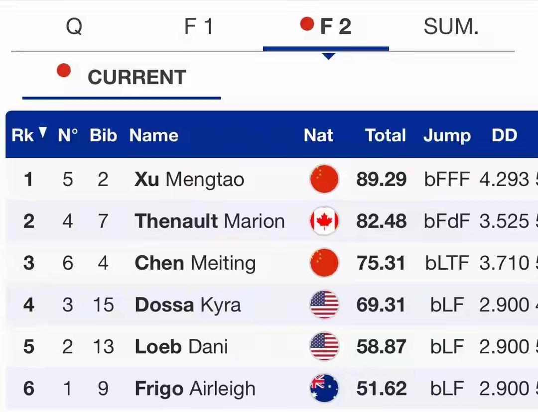 与徐梦桃一同闪耀赛场的,是中国年轻选手陈梅婷。她在决赛中选择了难度系数为3.710的动作,以稳健和流畅作为自己的比赛策略。她的腾空高度充分,空中翻转清晰利落,落地干净稳健,展现出了超越年龄的成熟与冷静。最终,裁判打出了75.31分,这个分数为她锁定了一枚宝贵的铜牌。这枚奖牌不仅是对她个人努力的最好回报,也预示着中国空中技巧项目后继有人,新生力量正在迅速成长。