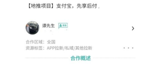 项目名称:支付宝邀请商家开通先享后付。收益价格:600 元 +/ 单以及 1.5% 至 4.5% 的商家流水分成。作业流程:推广员需寻找目标商家,向其介绍支付宝先享后付产品,说服并帮助商家成功开通该功能。