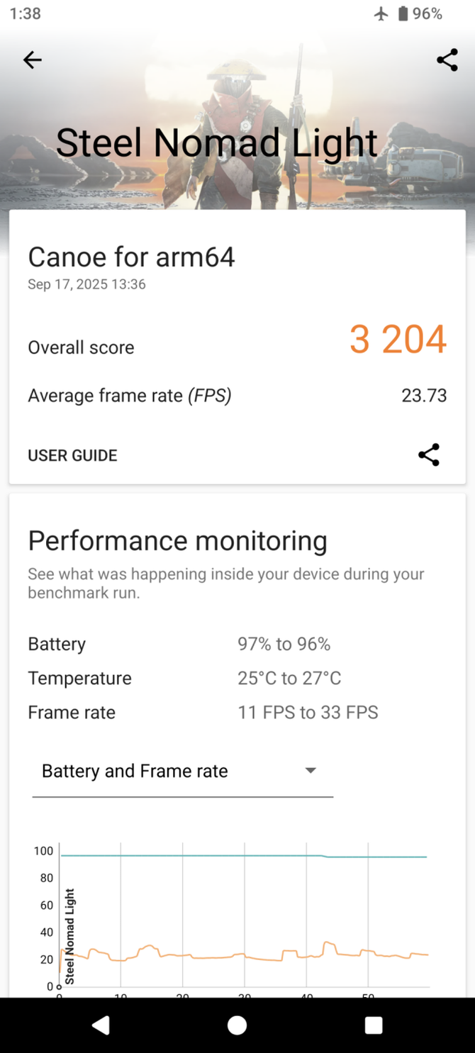 衡量游戏性能的3DMARK Steel Nomad Light测试中,可以看到高通第五代骁龙8至尊版的总体跑分为3204,基本上能够稳定流畅运行当下绝大部分的主流游戏,图形性能表现非常出色。