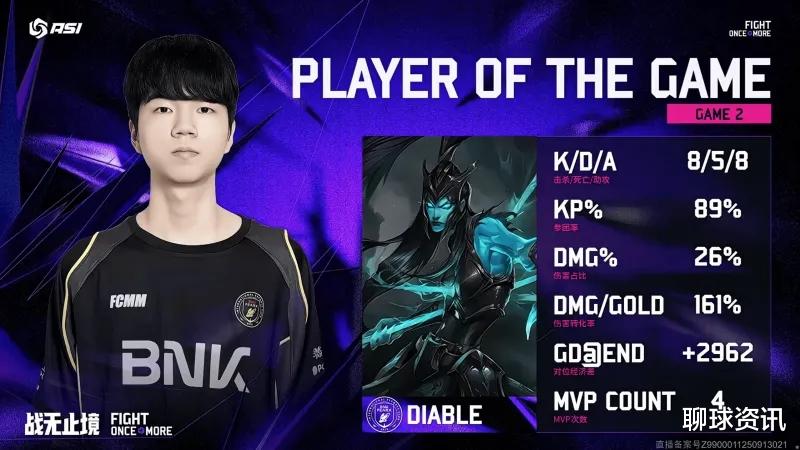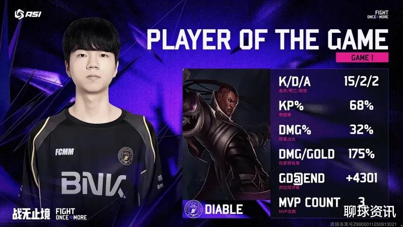 MVP表现:Diable卢锡安打出15/2/2战绩,伤害占比35%。