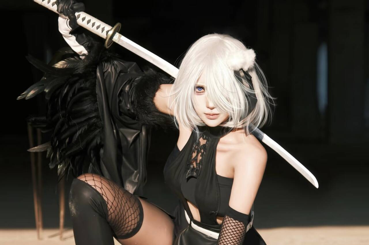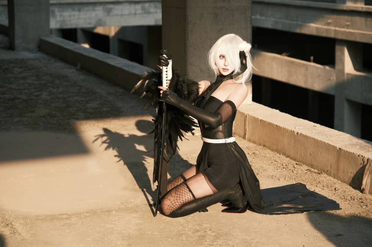 coser完美复刻了2B的经典造型,一身酷黑服饰,剪裁利落,将她的飒爽与性感巧妙融合。渔网袜与长靴的搭配,更添几分神秘与凌厉,每一处细节都精准还原,从服饰的褶皱到配饰的质感,都能看出用心。