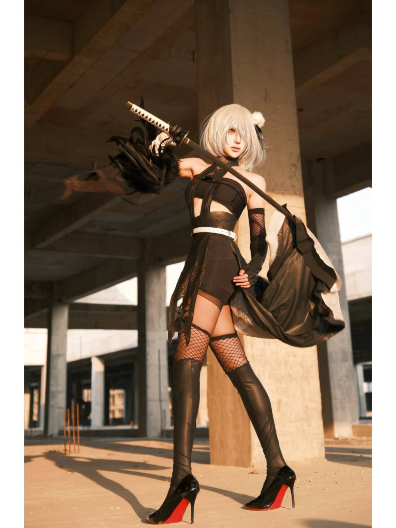 镜头下,2B或站立于空旷的建筑空间,长剑斜指,气场全开,仿佛正警惕着周遭,随时准备投入战斗,那是属于尤尔哈战士的本能与警觉;或单膝跪地,长剑拄地,眼神锐利,似是刚刚结束一场激战,又似在思索着关于存在与使命的哲学命题;亦或是以更具张力的姿态,将长剑置于肩头,银发在光影中流转,尽显她的冷艳与强大。