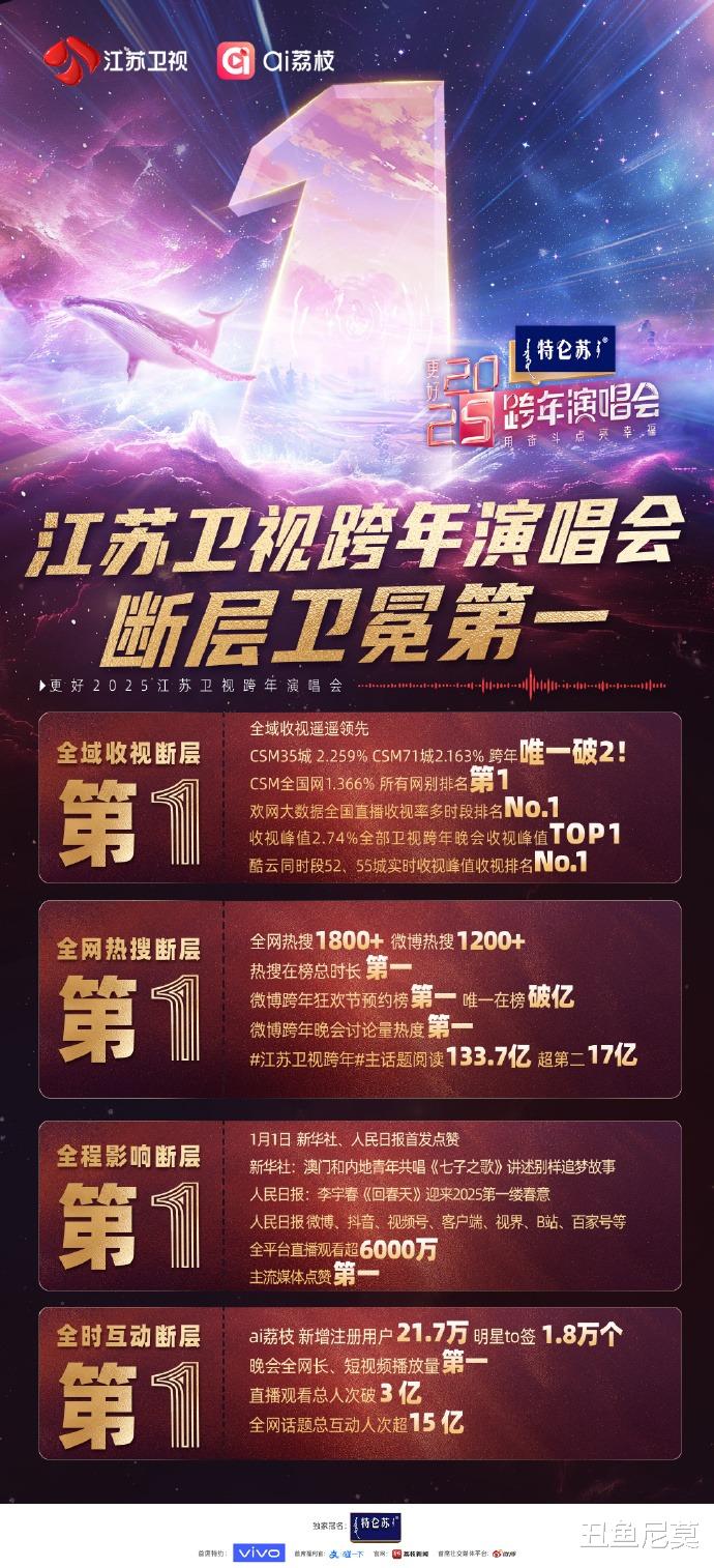 各卫视2025年的跨年演唱会已经结束,收视率也新鲜出炉,江苏卫视跨年演唱会实现了全域收视断层第1、全网热搜断层第1、全程影响断层第1、全时互动断层第1,成功断层卫冕。就小编的感受而言,江苏卫视2025年跨年演唱会能断层卫冕并不新鲜。因为,江苏卫视真的很走心,很懂观众。以歌手、歌曲为例,在江苏卫视2025年跨年演唱会上,小编喜欢的多位老牌歌手、实力唱将纷纷登台,或唱老歌,或吟新曲,或独唱,或合唱,全程让小编大饱耳福,回味至今。