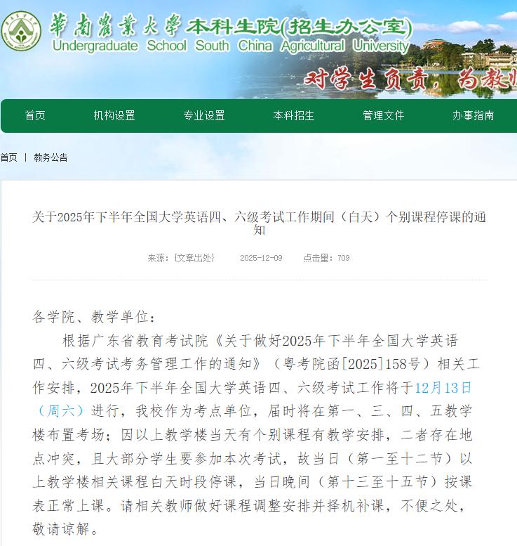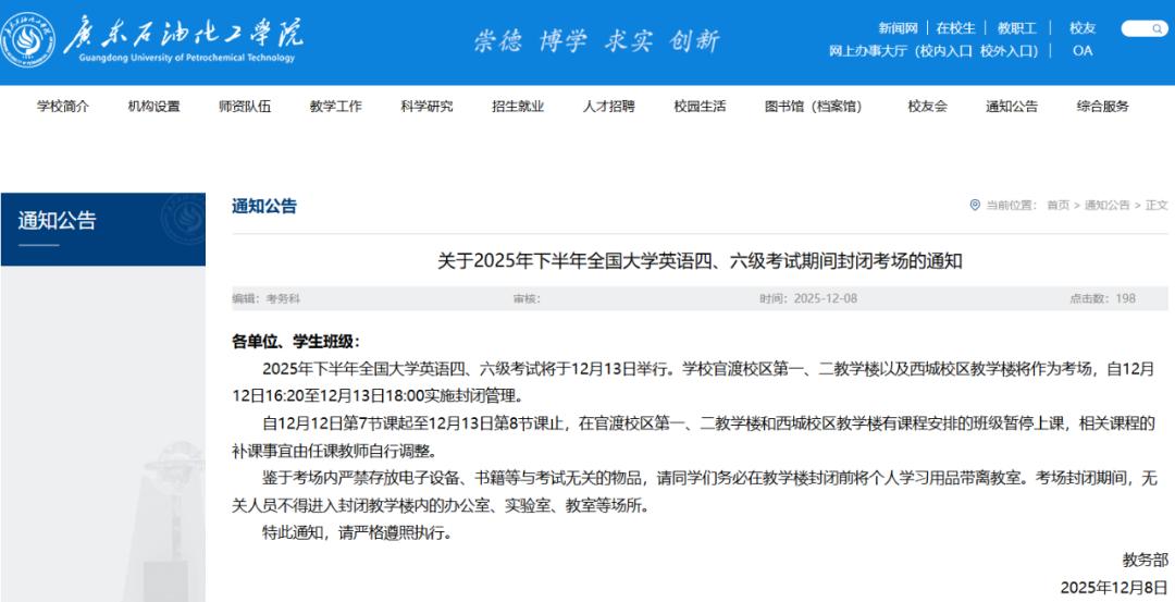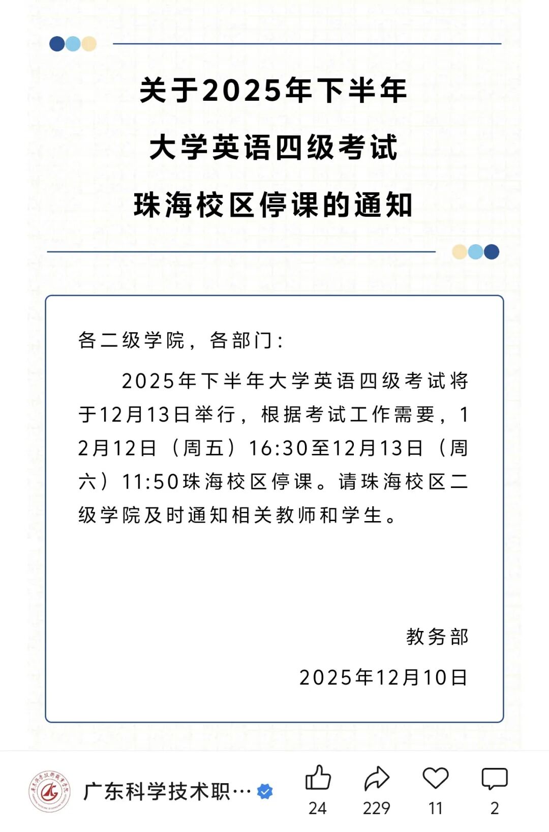 据广科院官微消息,根据大学英语四级考试工作需要,12月12日(周五)16:30至12月13日(周六)11:50珠海校区停课。