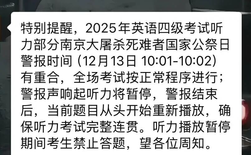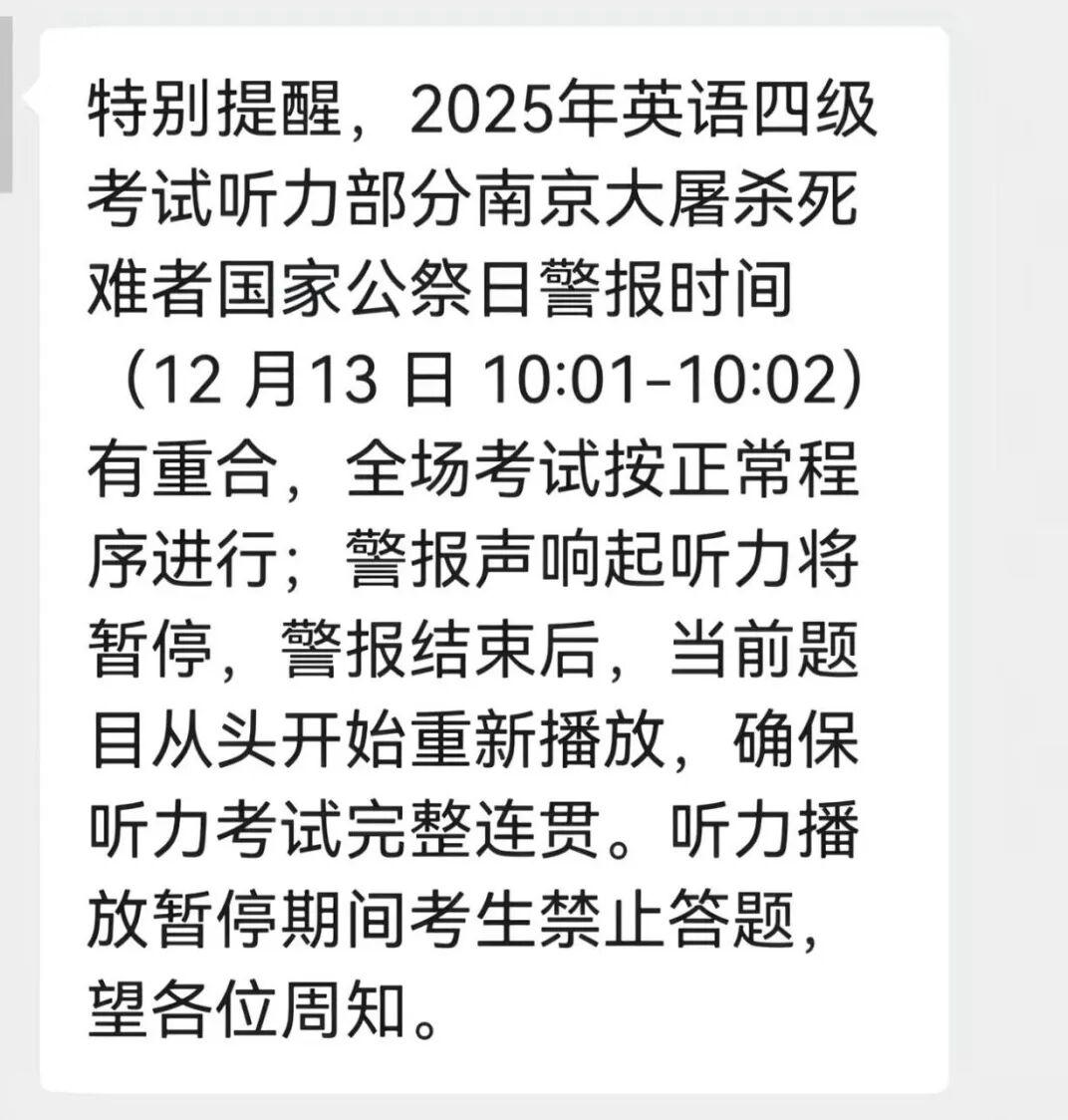 因四级考试听力部分与公祭日警报时间(预计12月13日10点01分至10点02分)存在冲突,所以部分高校对四级考试时间做出相应调整:在警报声响起时暂停听力,暂停期间禁止答题,考试结束时间相应顺延。