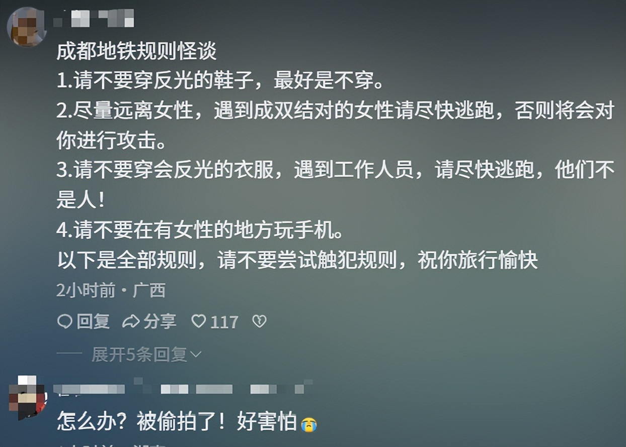 就是因为成都地铁的评论区突然打开了,官方帐号前两天发的地铁宣传的评论区,被各种阴阳起来,什么坐地铁需要注意穿鞋的规则,还有就是成都地铁终于原谅网友们了,让我们说话了。