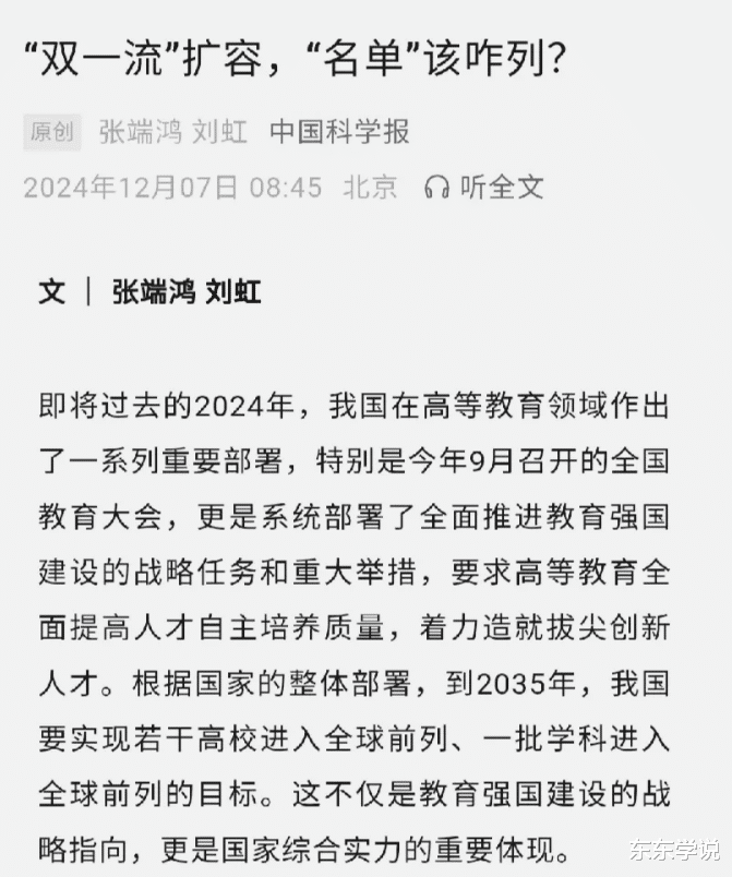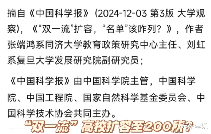 正当大家在热议第三轮双一流建设如何扩容的时候;中科院主管的《中国科学报》发表了同济大学教授张端鸿,复旦大学教授刘虹的《“双一流”扩容,“名单”该咋列?》的文章。