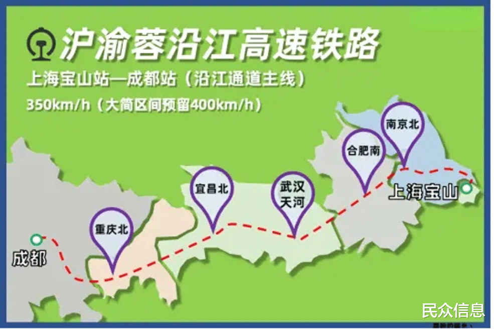 上海经重庆至成都高速铁路,简称沪渝蓉高铁,又称沿江高铁,它是中国“八纵八横”高速铁路网沿江通道的主干线 ,线路贯穿上海、江苏、安徽、湖北、重庆、四川六省市,全长约2100公里,设计时速350公里(重庆大足至成都段预留400公里/小时),总投资约5930亿元。由于整条线路比较长,项目按照批复一段开工建设一段开通一段模式建设。