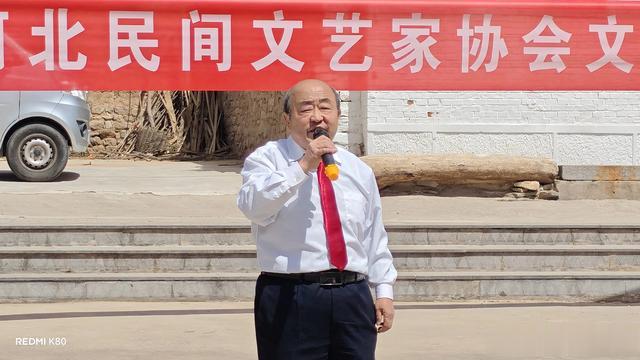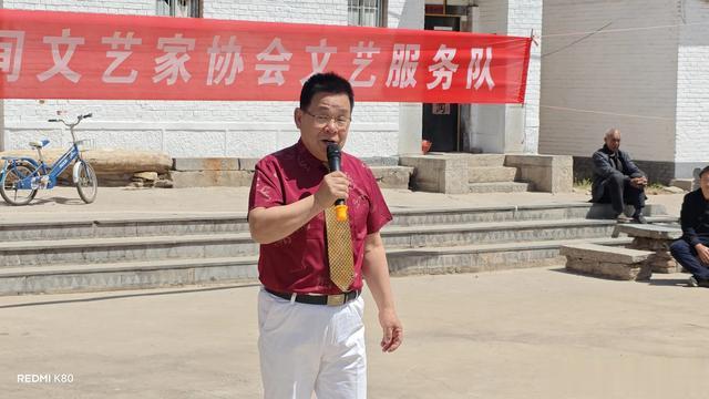 邯郸市民协副主席、峰峰民协主席牛骁鹏讲话,大家带着对老区人民的深深敬意来到台华村,我们愿用最美的歌声和舞蹈,表达对老区人民最诚挚的慰问和深深的敬意,希望精彩的演出能够给老区人民带来欢乐。
