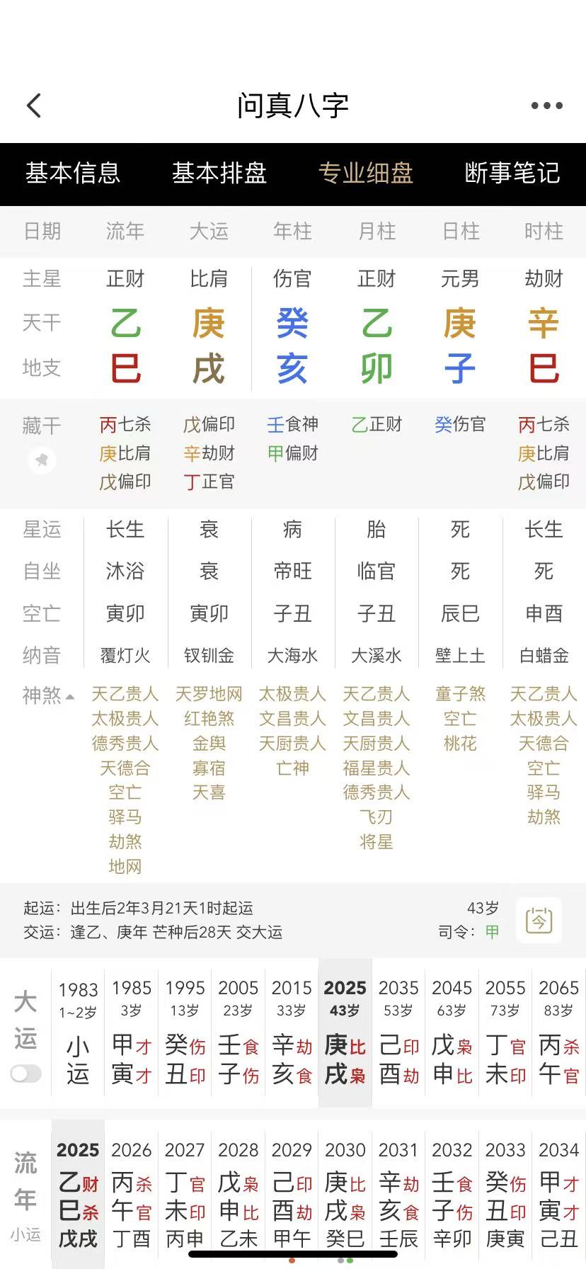 细细看了大运,前边一直走食伤生财的大运,可是流年完全没有好的匹配,只有走才运最好,因为走食伤虽然生财但也克官,而且才还必须是与命局形成亥子丑这样的财年才可以,比如走单纯的寅卯这种财年,容易寅巳穿,坏官。人生不平顺。所以导致整个命局很乱。