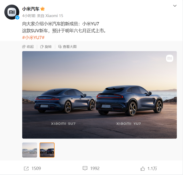 小米汽车微博已经发文官宣,小米首台suv YU7预计在明年6,7月份上市。可能有网友会问小米YU7怎么感觉没听过,其实小米YU7就是小米MX11,MX11只是代号,YU7才是真名。不过感觉6,7月份才上市有点久了,我觉得能早点上市就更好了。