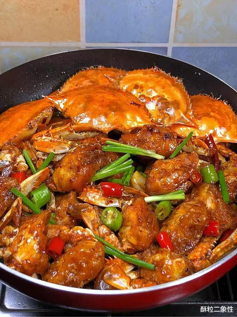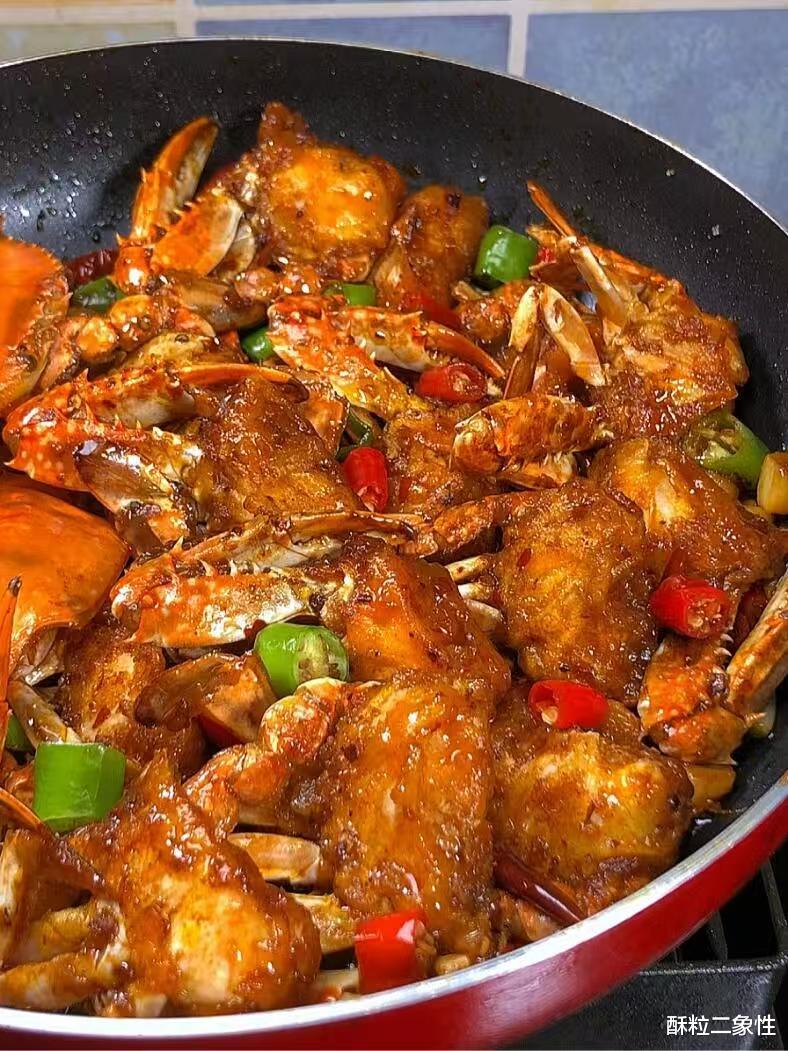 食材齐齐整整地摆在案板上,梭子蟹个大肉肥,姜蒜头、干辣椒跃跃欲试。梭子蟹的处理是关键一步,去掉腮,切成两半,切口处轻轻裹上淀粉,仿佛给它们穿上了一层“保护衣”。锅里宽油烧热,六成油温时,梭子蟹切口朝下下锅,只听“滋啦”一声,它们在油锅里迅速定型,变得金黄酥脆。那一刻,我仿佛听到了美味在油锅里绽放的声音。
