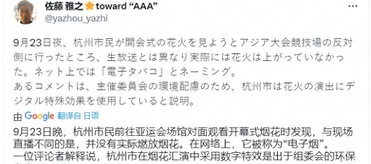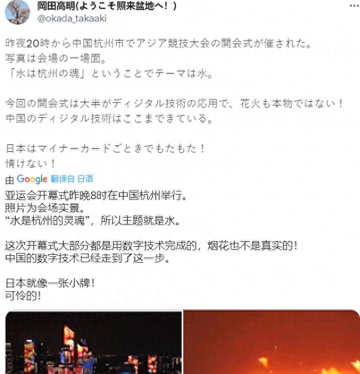 另一位日本网友:亚运会开幕式昨晚8时在中国杭州举行。 照片为会场实景。 “水是杭州的灵魂”,所以主题就是水。 这次开幕式大部分都是用数字技术完成的,烟花也不是真实的! 中国的数字技术已经走到了这一步。 日本就像一张小牌! 可怜的!
