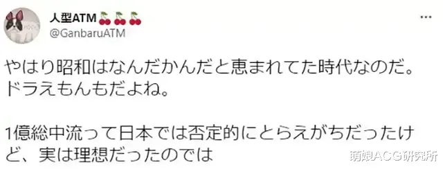 「昭和真的是富足的时代,《哆啦A梦》也是。只有爸爸赚钱还能买房、买车、养两娃一猫一机器人,现在根本不可能。」