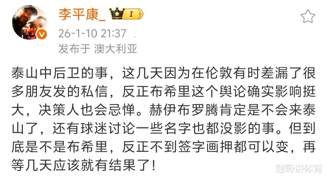 北京时间1月11日,当山东泰山球迷期待橙浪球迷会蒋会长爆料的新强力中卫霍伊布拉腾的时候,知名媒体人李平康也给山东球迷带来了一个坏消息,那就是这个强力中卫根本不会来泰山队的,当蒋会长在个人社交上爆料出原浦和红钻队长霍伊布拉腾成为山东泰山队谈判的新外援中卫人选后,从山东球迷的反应来看,大家对身高1米84,防守强悍、自由身的霍伊布拉腾还是非常喜欢的。