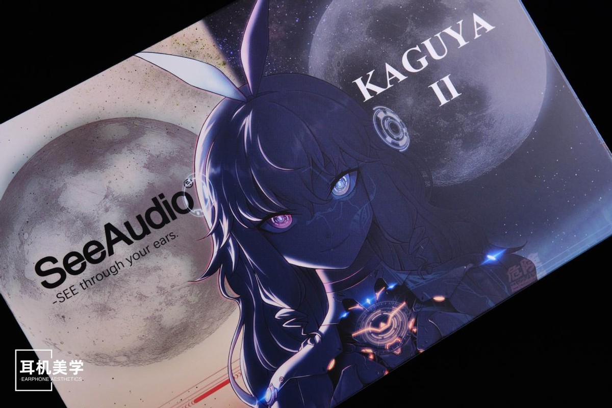 国内二次元品牌的插画水平参差不齐,SeeAudio算是其中比较出色的。辉夜二代的包装上,自家虚拟人物RINKO以科幻风格亮相,左右异色瞳与背景的“月之明暗面”相呼应,营造出契合品名KAGUYA(辉夜姬)的故事氛围。