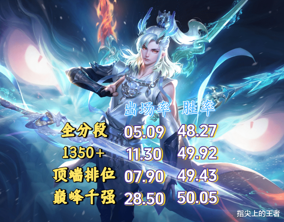 PS:数据取自全区巅峰战力前百,不包括隐藏数据的玩家,另外,双分路的英雄可能出场率会更高,因为会计算到一起,出场率仅统计小国标以上的英雄。