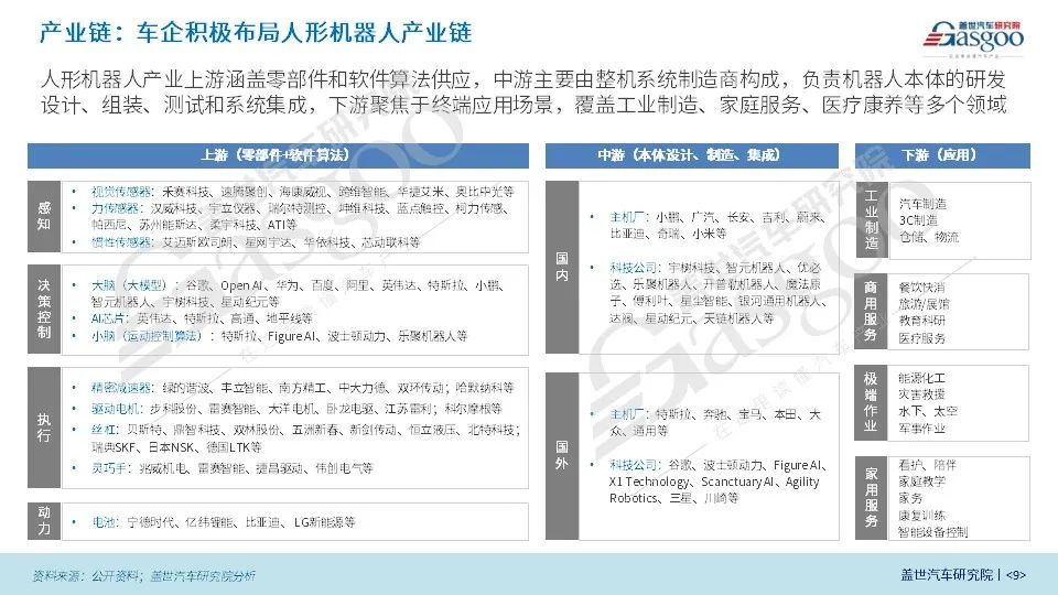从底层技术来看,人形机器人与智能汽车技术同源,均由“感知-决策-执行”三个层面构成,各层之间的连接方式也高度一致,因此自动驾驶领域的解决方案和技术经验能够在人形机器人领域实现复用。目前已有小鹏、比亚迪、广汽、长安等多家主机厂积极布局人形机器人产业链。