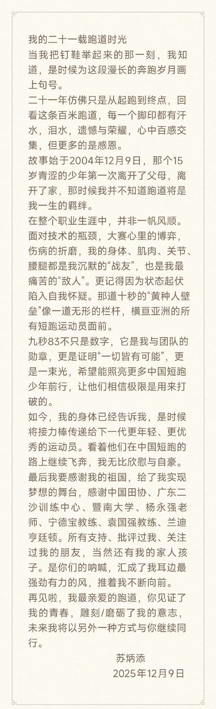他出生在中山农村,2009年考进暨南大学读经济学。边上学边训练,后来拿了硕士,在学校当老师。今年四月还被任命为体育学院院长。跑步二十一年,光破十秒就有十一次,东京奥运会那次半决赛跑出九秒八三,这成绩放在历史上都能进前一百。