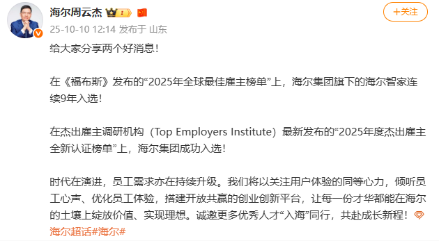 此外,海尔集团董事局主席、首席执行官周云杰社交媒体发文,在《福布斯》发布的“2025年全球最佳雇主榜单”上,海尔集团旗下的海尔智家连续9年入选。