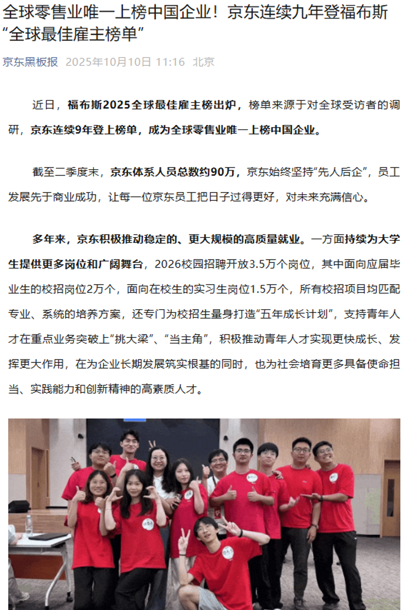 随后,京东黑板报发文表示,京东连续九年入选“福布斯全球最佳雇主”榜单,截至二季度末,京东体系人员总数约90万。京东始终坚持“先人后企",员工发展先于商业成功,让每一位京东员工把日子过得更好,对未来充满信心。
