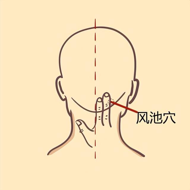 第一个 "开关" 是风池穴。风池穴在我们的后颈部,枕骨下面,两条大筋外缘的凹陷处,左右各有一个。找这个穴位的时候,大家可以先把头部稍微低下来,用双手的拇指分别放在后颈两侧,指尖向上,差不多在耳垂平行的位置,就能摸到两个凹陷的地方,这就是风池穴。