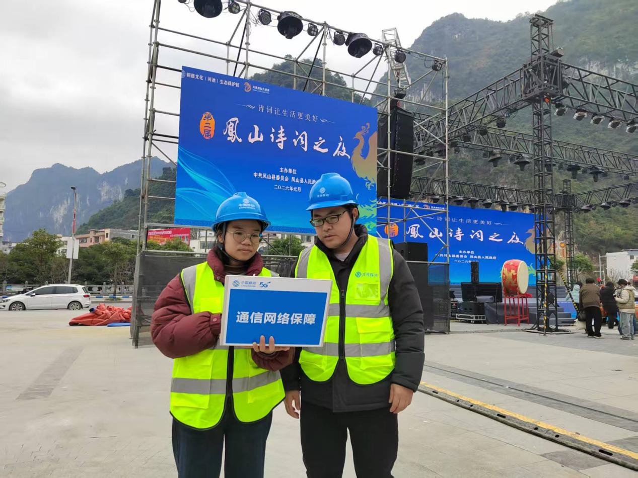 1月25日晚,河池市凤山县恒升广场,凤山县第二届诗词活动在万众瞩目中盛大启幕,虽然天空不作美,但现场诗韵悠悠、人头攒动,吸引了众多诗词爱好者与观众纷至沓来。在这场文化与艺术交融的盛宴里,中国移动凤山分公司凭借卓越的网络保障能力,为活动的顺利开展筑牢了坚实后盾,让诗意与科技完美交织。为应对活动现场可能出现的瞬时高并发通信需求,移动公司提前对周边基站进行了精准扩容。申请新增应急通信车和微型基站,优化网络覆盖布局,确保核心区域网络容量翻倍。同时,积极运用先进的5G - A技术,大幅提升网络下载速率,让观众在沉浸于诗词之美时,能够毫无阻碍地进行视频拍摄、直播上传等操作,真正实现了“现场吟诗”与“云端共享”的无缝衔接,让诗词的魅力跨越时空,传递给更多人。活动期间,后台人员通过网管系统,对网络关键指标进行实时、精准监控;前台测试人员则不间断开展语音、数据业务测试,确保网络运行始终稳定流畅。提前优化基站参数,有效避免了人流短时聚集导致的网络“卡顿”问题。