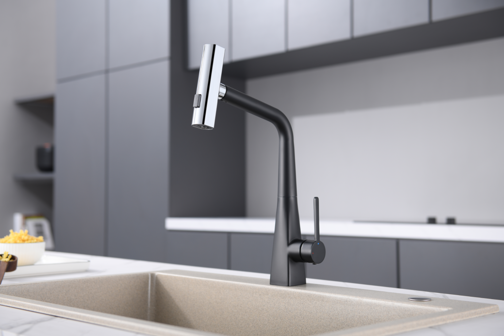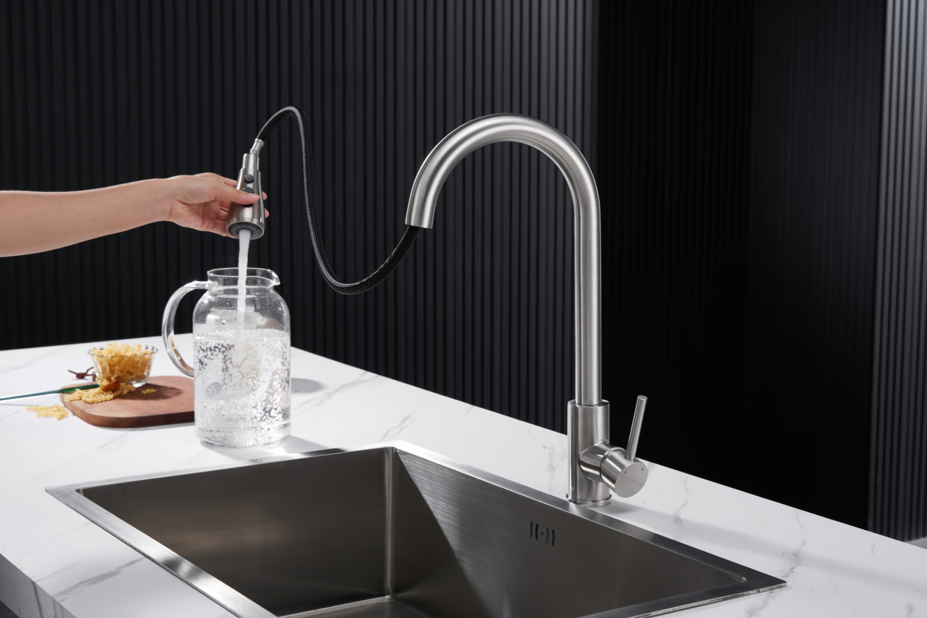 这款水龙头配备抽拉式出水管,贴合实际使用需求,轻轻一拉即可延展操作半径,轻松清洁大型餐具与水槽边角。回缩顺畅自然,操作毫不费力,让厨房清洁的每一步都利落而优雅。