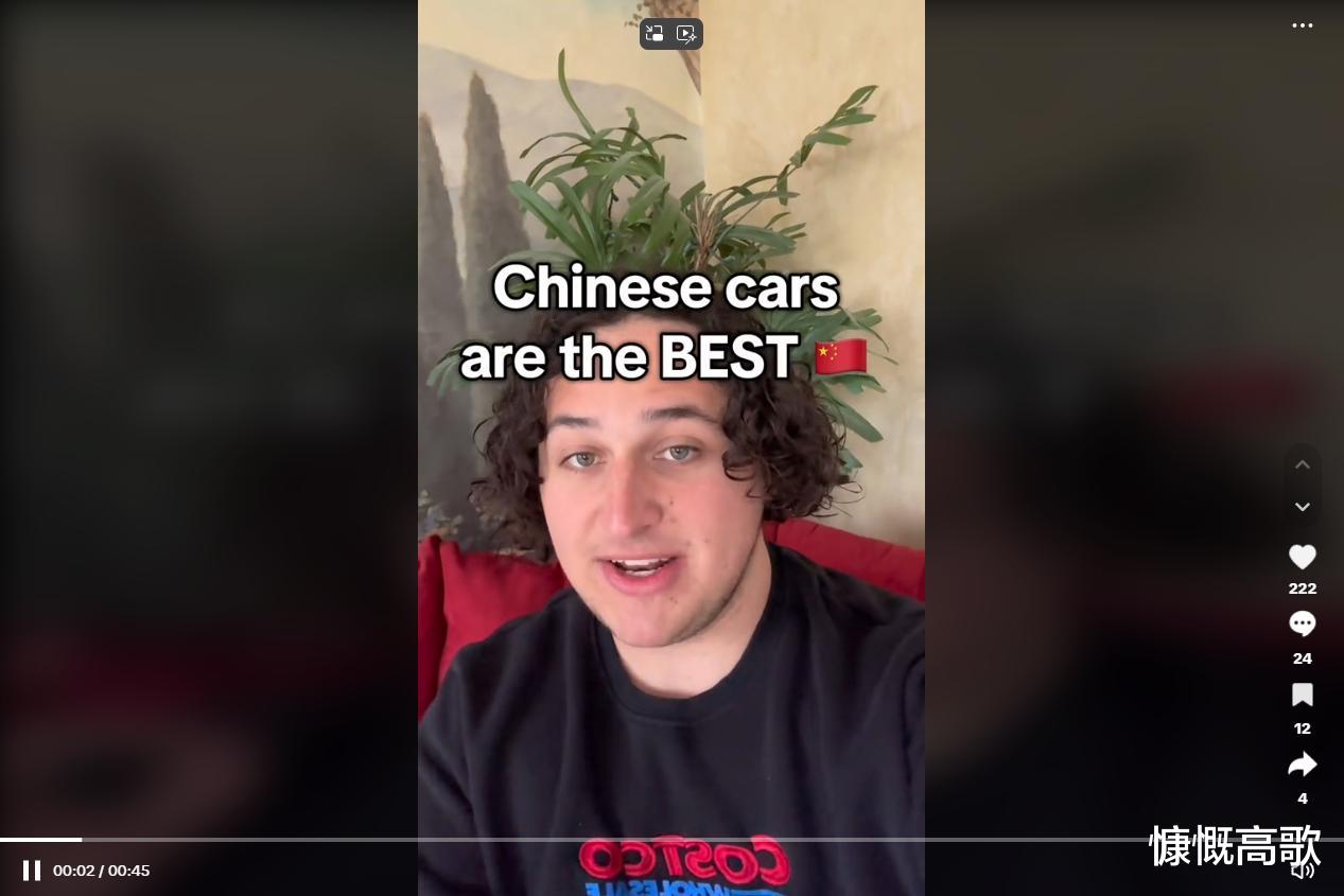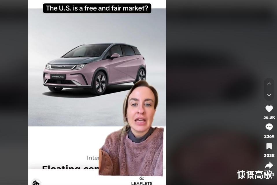 “当我在刷小红书时看到了这辆车。我们都知道,美国不是对所有人都说要进行‘自由和公平的贸易’吗?(但是)在这里却没有店卖这辆车,就因为它产自中国……我完全无法理解,我想要一辆比亚迪海豚。”