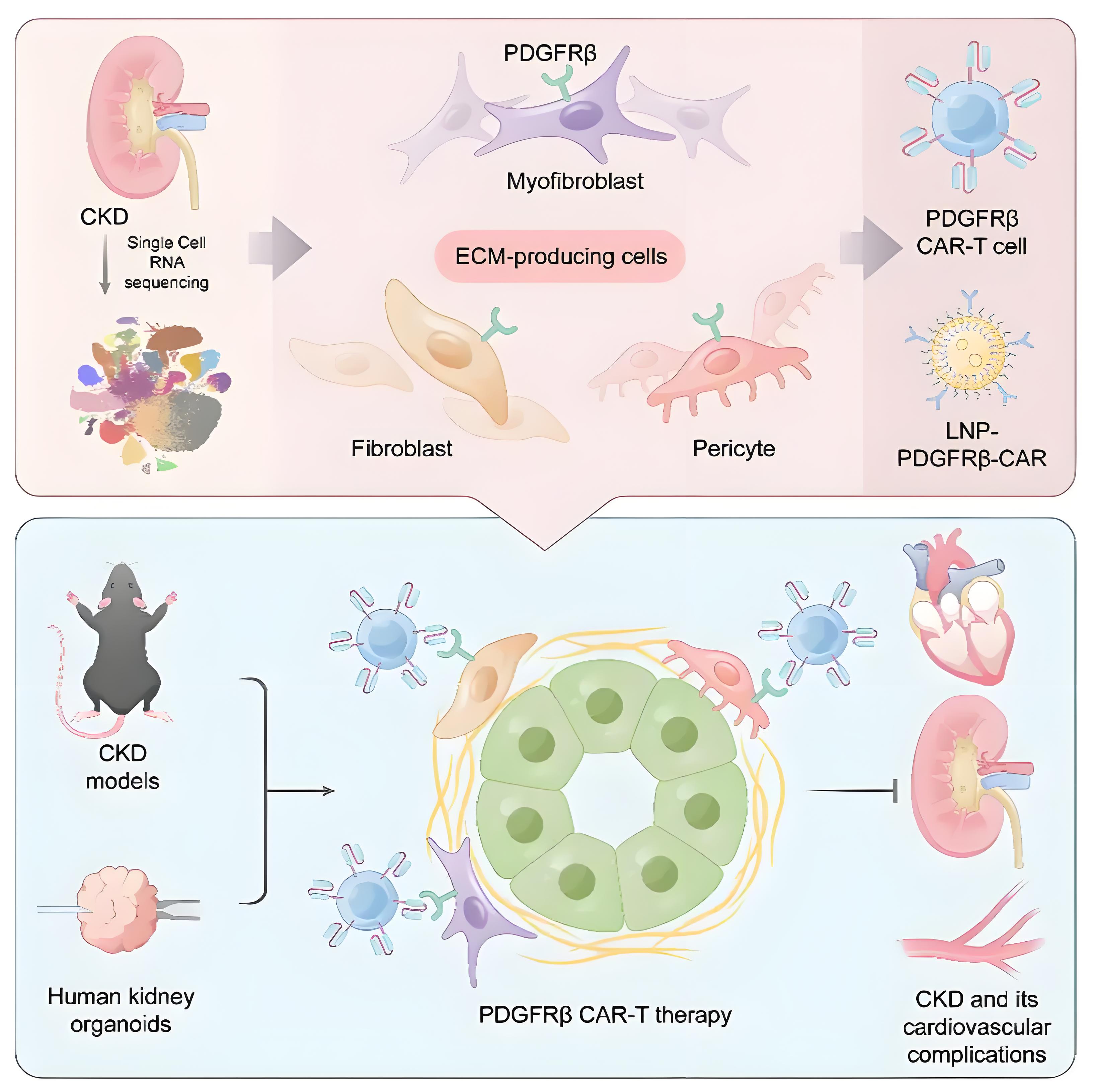近年来,嵌合抗原受体T细胞(CAR - T)疗法以其精准靶向的优势,在肿瘤治疗领域取得了巨大成功,并在非肿瘤领域展现出广泛潜力。易凡教授团队敏锐把握这一技术机遇,前瞻性地将研究聚焦于“抗肾脏纤维化CAR - T疗法”,明确了CKD状态下肾脏细胞外基质(ECM)的主要细胞来源,并将血小板衍生生长因子受体β(PDGFRβ)作为靶点,成功构建出靶向PDGFRβ的CAR - T细胞(PDGFRβ CAR - T),为肾纤维化治疗开辟了新路径。