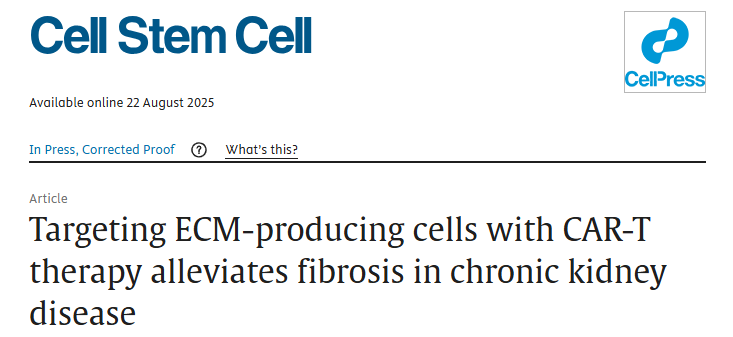 2025 年 8 月 22 日,山东大学易凡教授团队在国际权威学术期刊《Cell Stem Cell》在线发表了一项题为《Targeting ECM - Producing Cells with CAR - T Therapy Alleviates Kidney Fibrosis in Chronic Kidney Disease》的最新研究成果,为慢性肾脏病(CKD)及纤维化相关疾病的治疗带来了创新性策略。