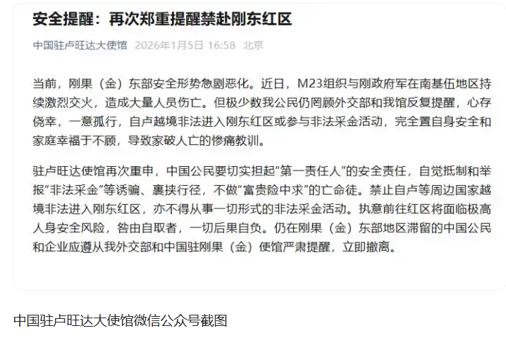 “切勿前往!”中国驻卢旺达大使馆5日发布的这则安全提醒,字里行间透着一股不同寻常的急迫。刚果(金)东部北基伍、南基伍等省份安全形势急剧恶化,使馆直接把话挑明:禁止中国公民自卢旺达等周边国家越境非法进入。