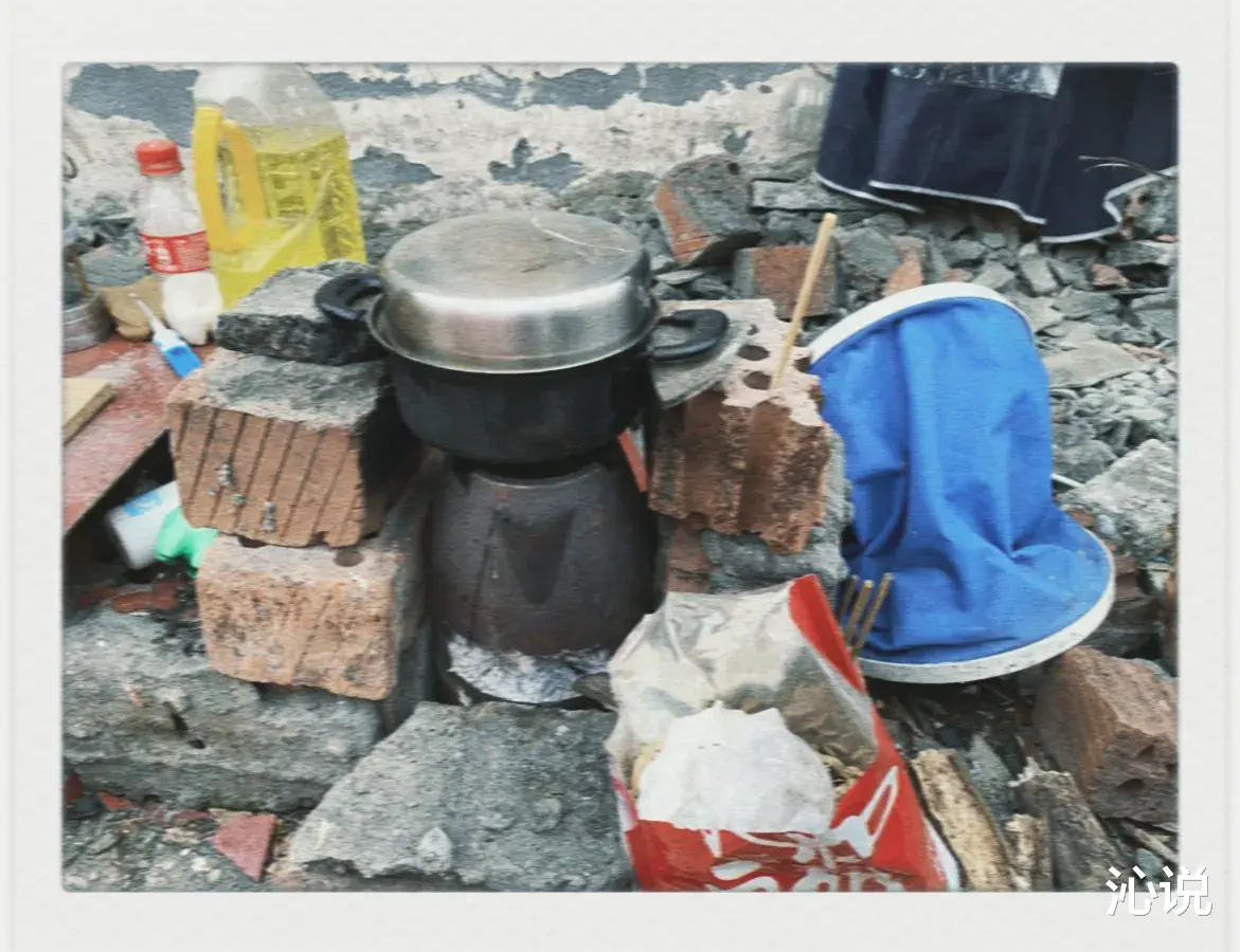 一把坏了的电水壶就是炉灶,菜板是块破瓷砖,两个5L矿泉水瓶子装着公园打来的生活用水。