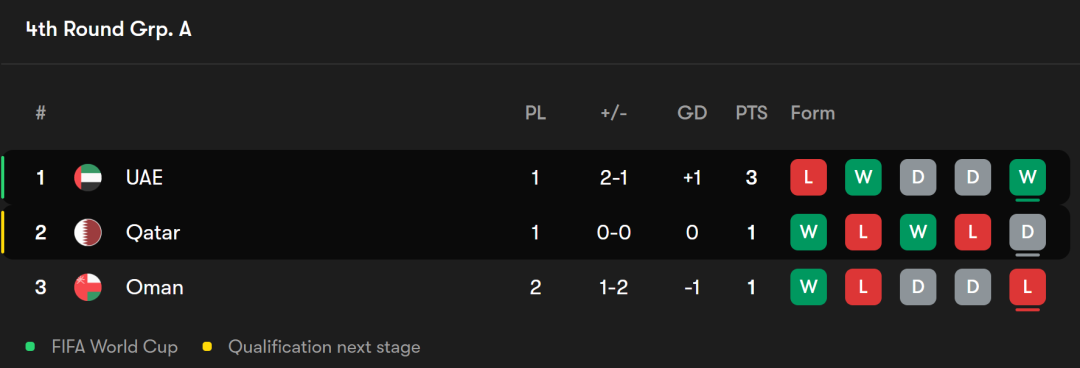 在2026年美加墨世界杯亚洲区预选赛第四阶段A组,阿联酋1战1胜积3分排名第1,卡塔尔1战1平积1分位列第2,这场比赛对双方来说都至关重要。今晚卡塔尔如能战胜对手,那么他们获得直接出线资格,阿联酋去打附加赛;如果双方握手,那么就是阿联酋直接出线,卡塔尔去参加附加赛。
