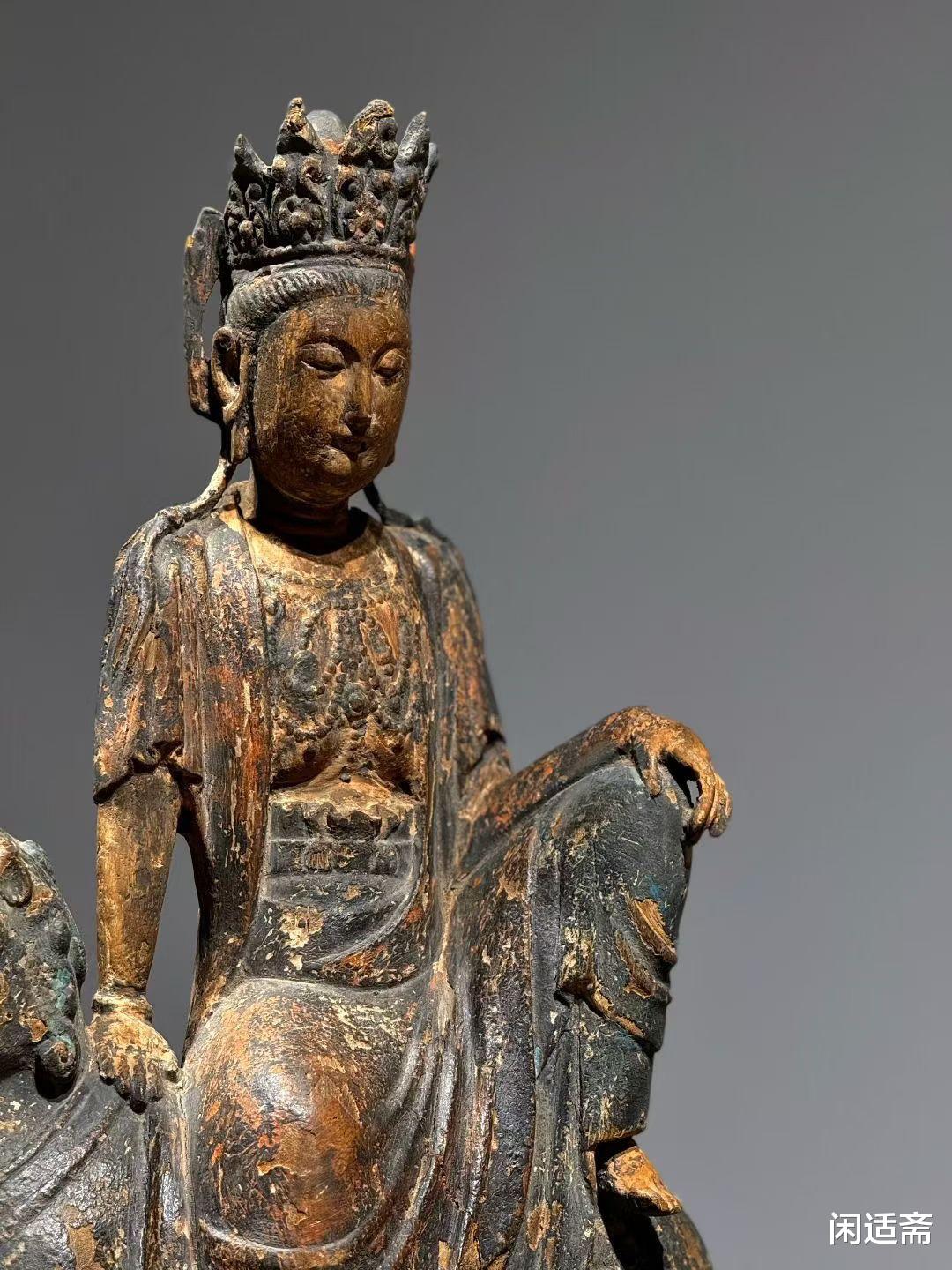 文殊菩萨造型优美,身姿舒展却不失庄重,身着的袈裟线条流畅自然,衣褶纹理疏密有致,既展现出织物的垂坠感,又通过简练的线条勾勒,避免了繁复装饰的堆砌,尽显宋代 “去繁就简” 的审美追求。其开脸慈祥,眉眼弯弯,嘴角微扬,面容饱满却不失清秀,没有夸张的表情,唯有一份沉静淡然的笑意,仿佛能包容世间万物,传递出 “大智若愚” 的慈悲气场;整体神态端庄祥和,既有着菩萨的神圣庄严,又带着贴近人间的温润亲和,让人观之便能心生平静。