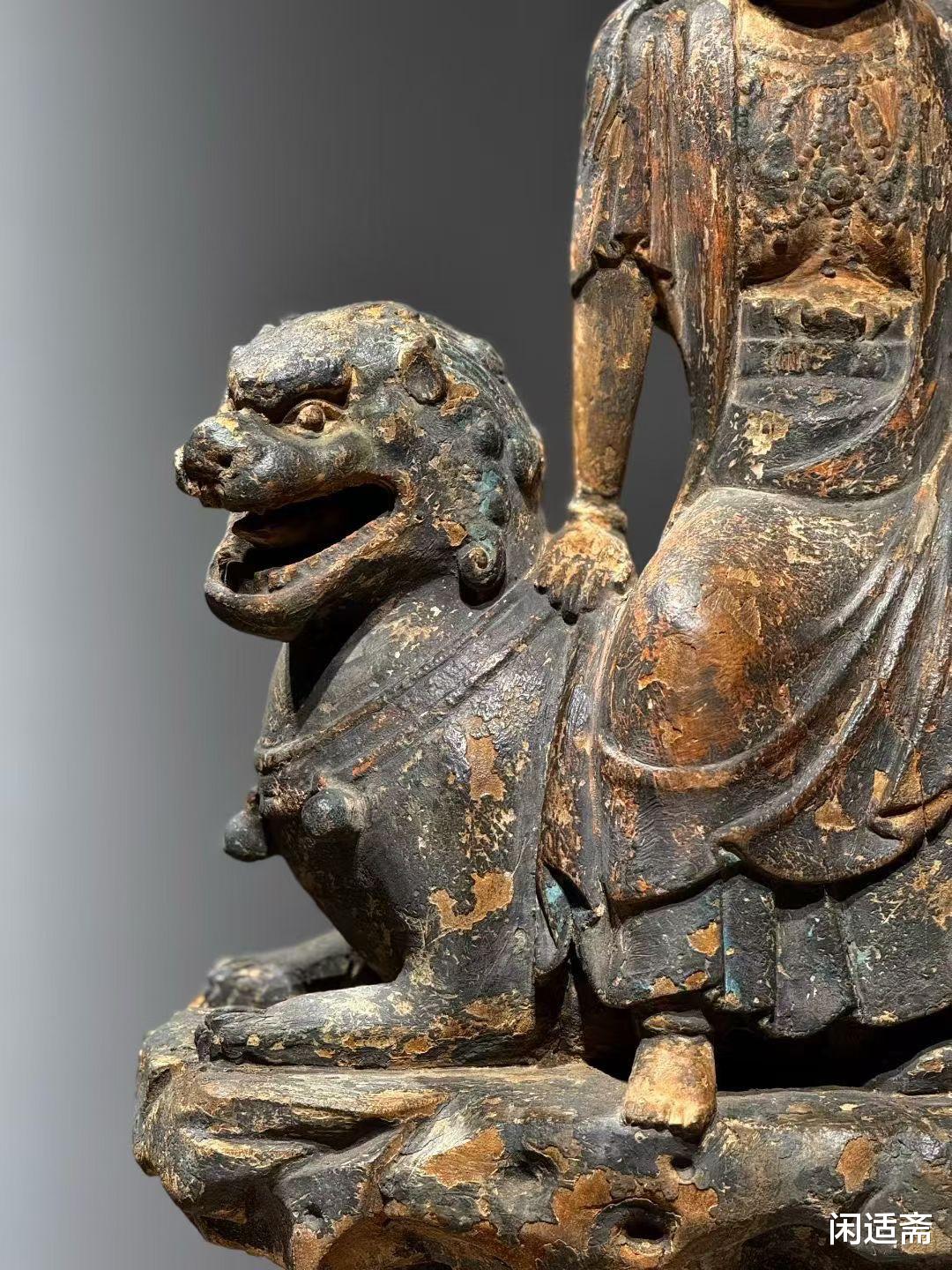 尤为精妙的是,文殊菩萨呈自在坐姿坐于卧狮背上—— 卧狮作为文殊菩萨的 “坐骑”,象征着智慧能降伏 “烦恼之兽”,此处的卧狮并非凶猛咆哮之态,而是温顺伏卧,姿态慵懒却暗藏力量,与菩萨的自在坐姿相互呼应,既凸显了 “以智驭力” 的深意,又让整体造像动静结合,充满生活气息。这般造型,恰如宋代文人追求的 “动静相济、天人合一”,让神圣的造像多了几分烟火气与亲和力。