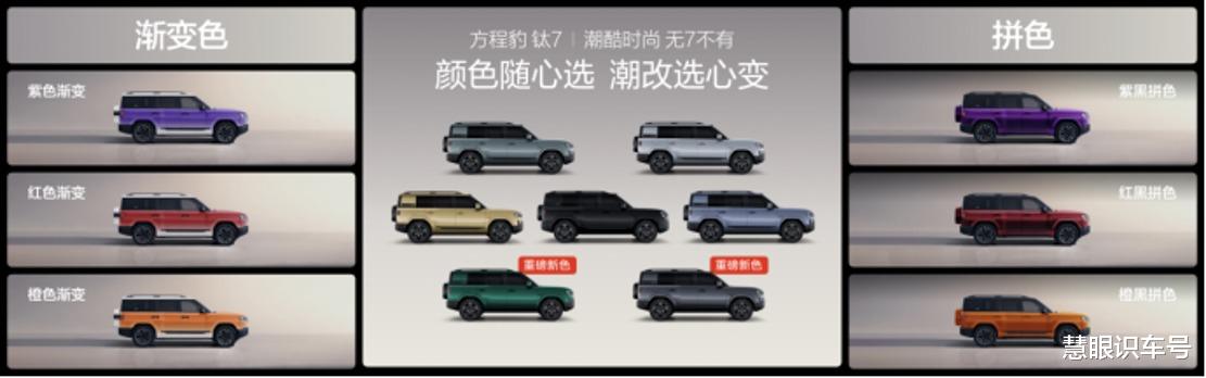 为了让广大用户选得尽兴,钛7直接一步到位,带来了7款外观颜色、3款内饰颜色,同步在官方商城上架了6款潮改方案,可满足不同用户的审美偏好。