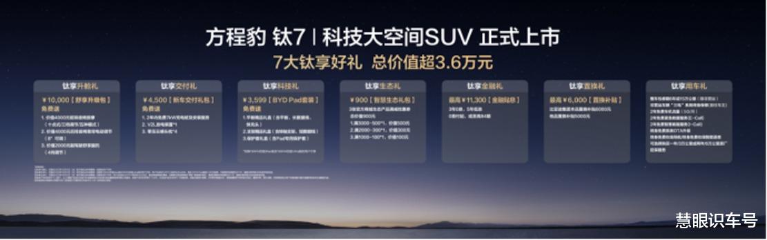 在购车权益上,方程豹更是诚意十足,为首批车主带来了总价值最高超3.6万元的7大钛享好礼!其中包括:覆盖多项座椅舒适配置的总价值10000元舒享升级包、价值3599元的BYD Pad套装、价值4500元的新车交付礼包均免费送;提供3年0息、5年低息、0首付起或至高84期等多重金融方案以供选择,金融贴息最高价值11300元;还有最高价值6000元的置换补贴、价值900元的智慧生态礼包,以及2年5G每个月的免费车机流量、非营运车辆长达6年或15万公里的整车包修、“三电”系统的终身保修、终身免费系统OTA升级等,让每一个家庭都能轻松拥抱钛7,让美好生活触手可及。