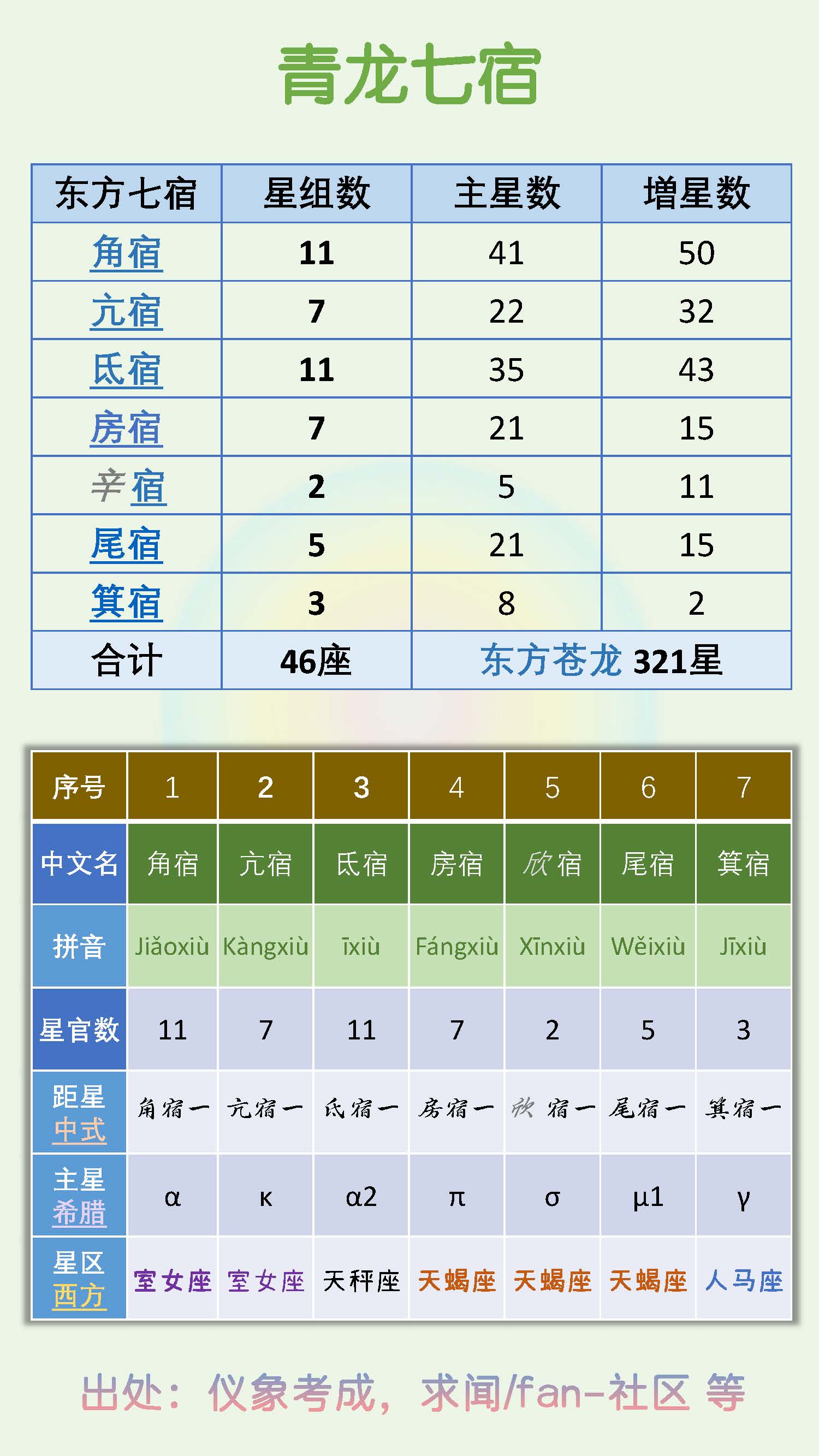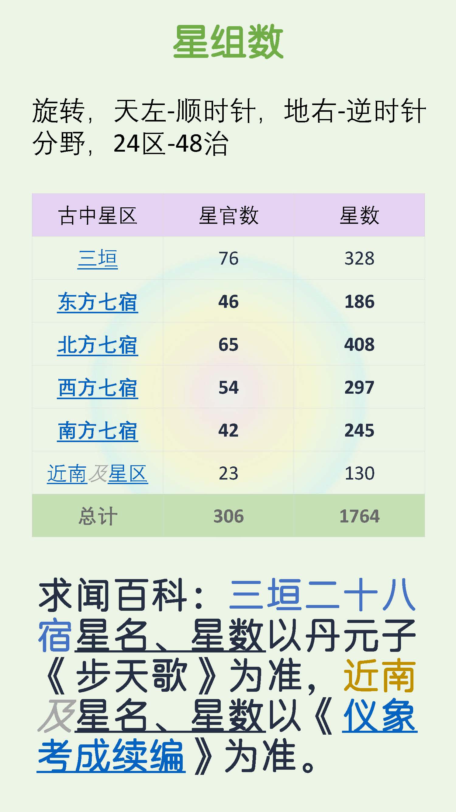 求闻百科:三垣二十八宿星数以丹元子《步天歌》为准,近南及星名、星数以《仪象考成续编》为准。