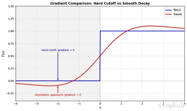 ReLU 在x=0处有不连续性(导数从0跳到1)。Swish 在任何地方都是无限可微的,这意味着梯度景观是平滑的。这种平滑性是否有助于 Swish 的性能还不是100%清楚但它可能有助于优化
