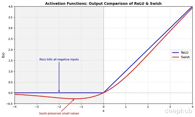 Swish 被发现比 ReLU 效果更好,但就像深度学习中的许多事情一样我们并不确切知道为什么 Swish 效果更好,不过倒是可以总结出以下的区别: