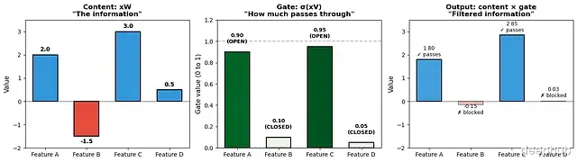 特征2:内容为负(-1.5),门值低(0.1)→ 被阻挡(-0.15)