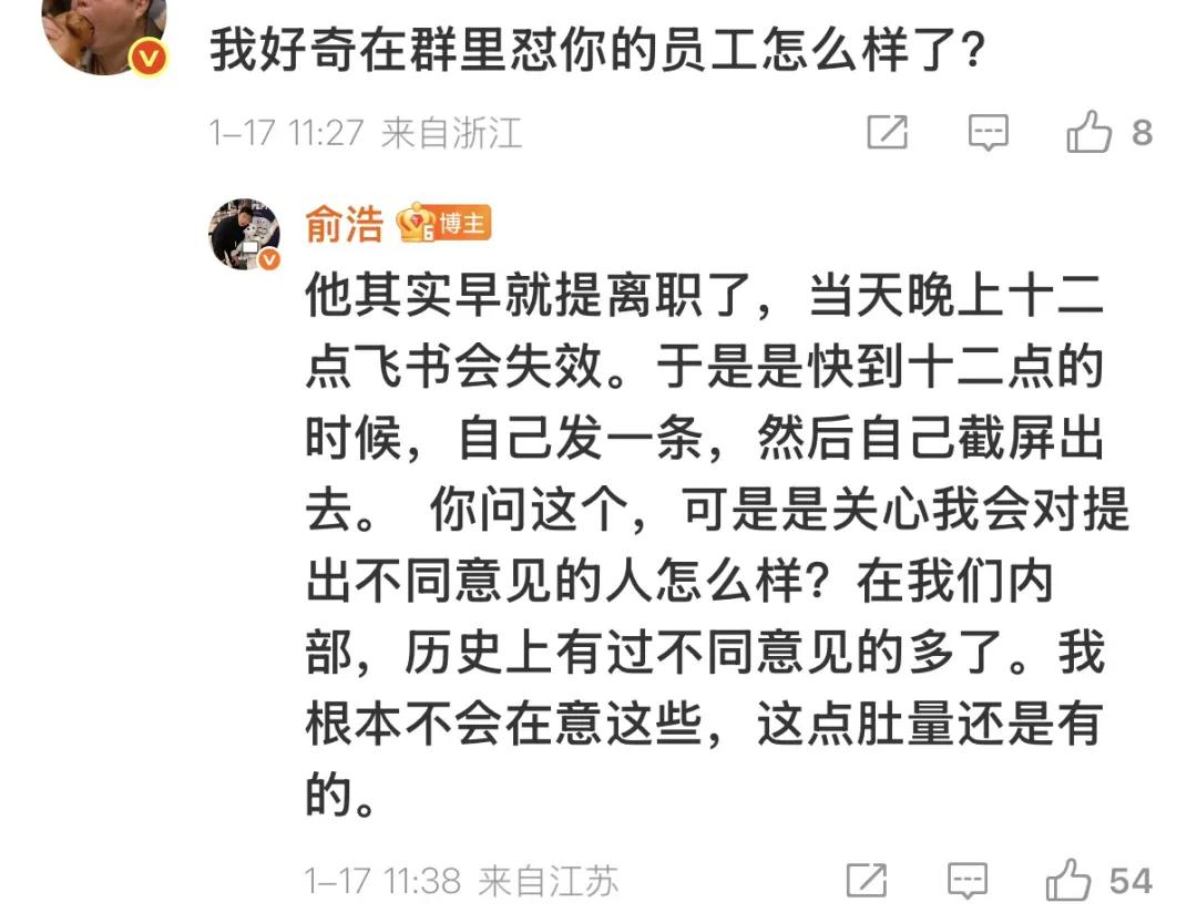 此外,俞浩还在微博评论里回复了那位“怒怼”他的员工情况: