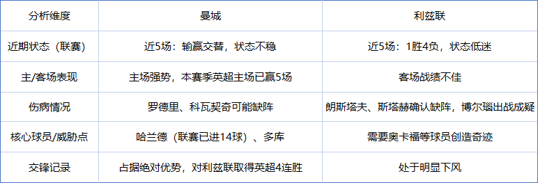 曼城vs利兹联这场英超对决,曼城和利兹联从积分榜位置到近期状态都形成鲜明对比,核心的看点在于状态不佳的曼城回到主场,能否在面对深陷困境的利兹联时顺利找回胜利的感觉。