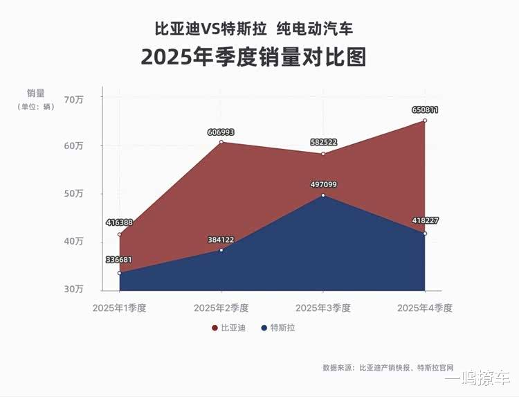 实际上,比亚迪纯电销量超特斯拉并不是偶然,而是比亚迪长期技术积累与全球化布局的必然结果。作为全球最大新能源汽车车企,比亚迪 2025年新能源汽车总销量高达460.2 辆,其中纯电车型的亮眼成绩,印证了其在纯电赛道的核心竞争力。从季度数据来看,比亚迪在2025 年四个季度均持续领先特斯拉,1至4季度销量分别为650811 辆、606993辆、582552辆和418227 辆,而特斯拉同期销量为416388辆、384122 辆、497099辆和336681辆,连续五个季度的领先态势,彰显了比亚迪稳定且强劲的市场号召力。