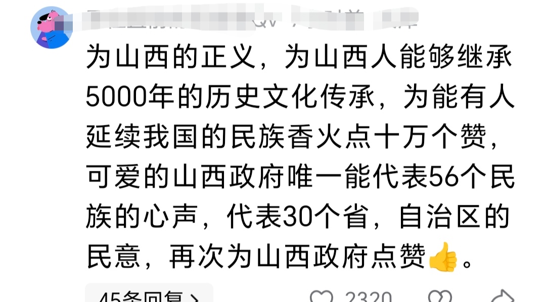 支持的人说,这是山西的正义,传承了5000年的历史文化传承,为他们点赞。
