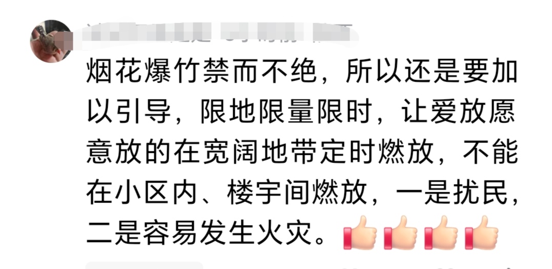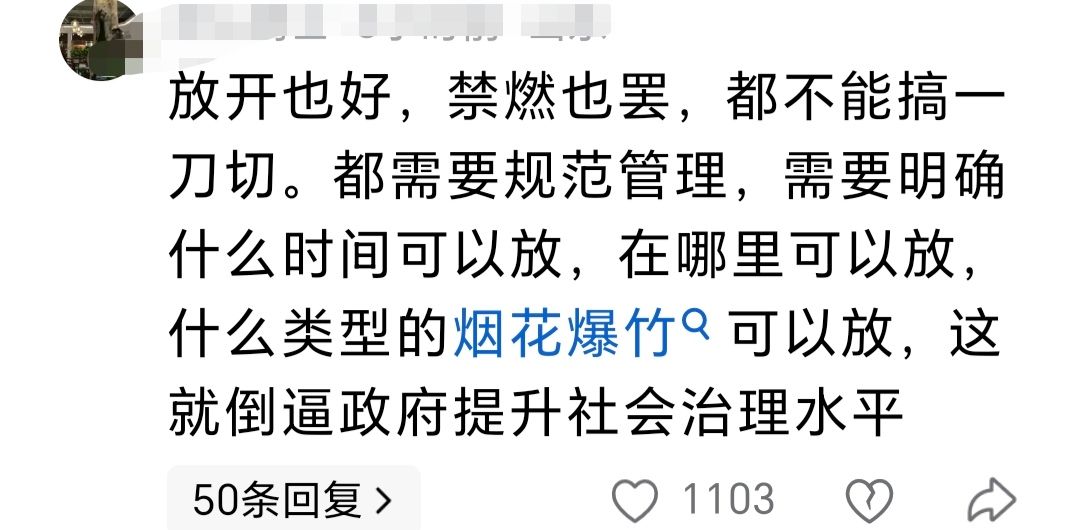 还有网友说了,不论是放开还是禁燃,都不应该搞一刀切,还是规范管理,什么时间可以放,在哪里放,放什么类型的烟花爆竹,这可以提升社会治理水平。